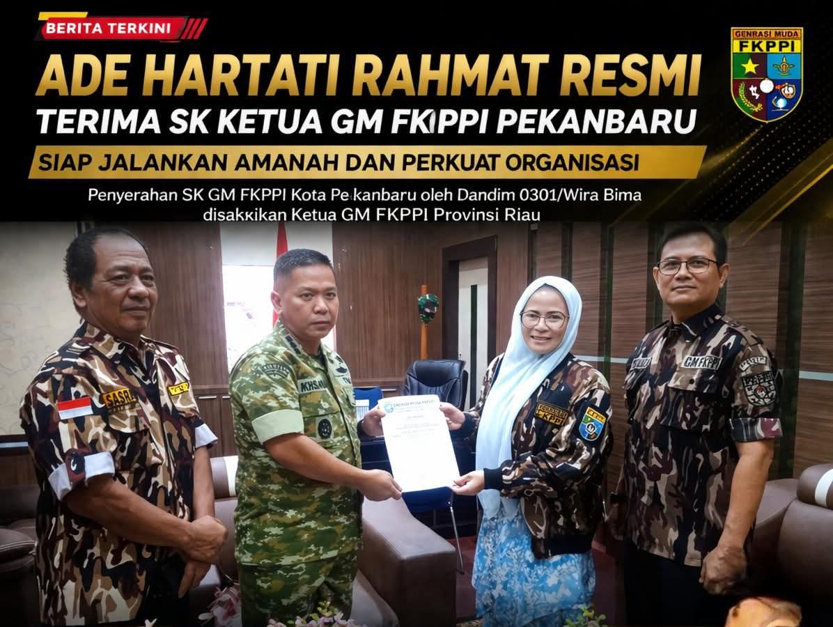 Artinya kepemimpinan ini ditandai dengan penyerahan SK tersebut kepada pihak Ade Hartati Rahmat, M.Pd sebagai Ketua GM FKPPI Kota Pekanbaru. Penyerahan SK ini dilakukan langsung kepada Ketua Dewan Pembina Dandim 0301/Wira Bima, Kolonel Infanteri Ikhsanudin, S.Sos., M.M, serta disaksikan oleh Ketua GM FKPPI Provinsi Riau, Yoyok Puji Raharjo, SH pada sebuah pertemuan resmi yang berlangsung pada Jumat (17/4/2026).