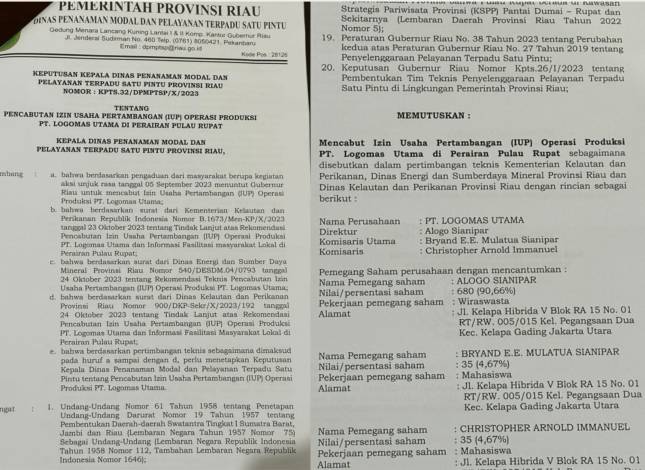 Pencabutan IUP PT Logomas Utama tersebut tertuang dalam Surat Keputusan (SK) Kepala DPM-PTSP) Provinsi Riau Nomor: KPTS 32/DPMPTSP/X/2023 tentang pencabutan IUP PT Logomas Operasi Produk PT Logomas Utama di Perairan Rupat.