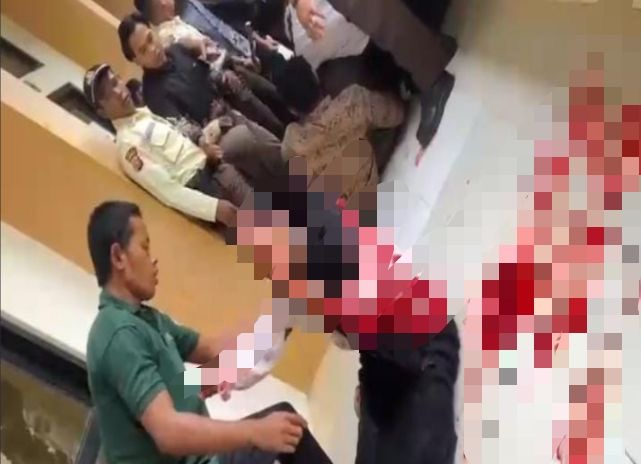 Dalam rekaman, terlihat seseorang tergeletak bersimbah darah di depan ruangan. Sementara nampak pria seperti berbicara dengan korban.