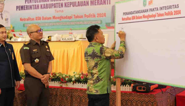 DERAKPOST.COM – Penandatanganan Pakta Integritas Netralisasi ASN dalam menghadapi Pemilu dan Pilkada tahun 2024 dilakukan di Kabupaten Meranti.