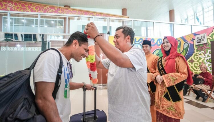 Kedatangan pesawat Air Asia dari Kuala Lumpur menjadi momen spesial, di mana dua wisatawan dari Finlandia dan India disambut langsung oleh Kepala Dispar Riau, Roni Rakhmat, yang memberikan selamat dengan bunga dan cinderamata.
