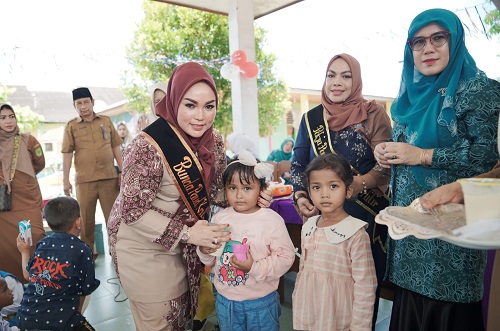 Tak hanya datang bersilaturahmi saja, Ketua PKK Rokan Hilir ini memberikan siswa bingkisan dan makanan sehat. Siswa dan orang tua menyambutnya dengan antusias. **Har/Rul