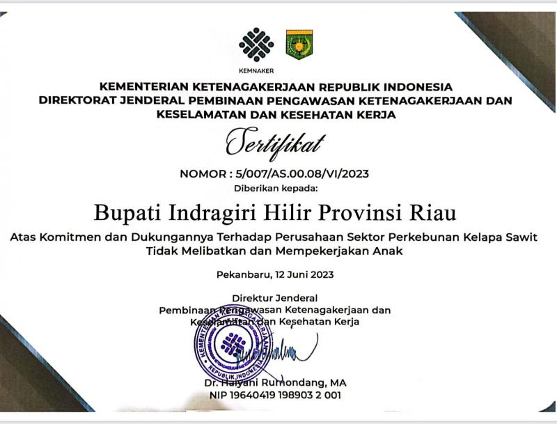 Penghargaan berupa sertifikat dengan nomor : 5/007/AS.00.08/VI/2023 dan ditandatangani Dr Haiyani Rumondang MA ini diberikan saat pencanangan Perkebunan Kelapa Sawit Terbebas dari Pekerja Anak yang ditaja Kemenaker RI secara daring dan dibuka secara langsung oleh Menteri Ketenagakerjaan (Menaker) RI Ida Fauziyah, Senin 12 Juni 2023.