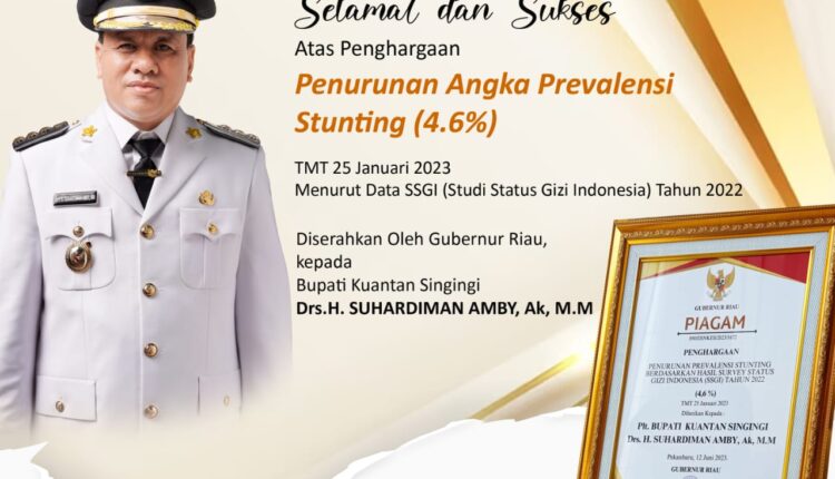 DERAKPOST.COM – Dinilai telah berhasil turunkan angka stunting, maka Bupati Kuansing, Drs. H. Suhardiman Amby, Ak. MM terima penghargaan, dari Gubernur Riau, Senin (31/7/2023).