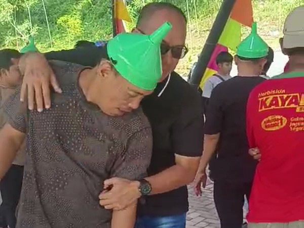 DERAKPOST.COM – Ardianto (40) tak kuasa melawan saat dirinya tiba-tiba diciduk polisi di tengah lomba HUT RI. Pria ini tampak tengah asyik mengikuti lomba, dengan menggunakan corong hijau di kepalanya.