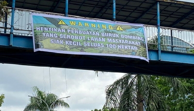 Kemudian terlihat itu disekitar JPO MtQ Pekanbaru juga ditemukan spanduk bernada serupa. Yaitu “Warning!!, Hentikan perbuatan buruk Bombing yang Serobot lahan Masyarakat Siak Kecil seluas 100 H”.