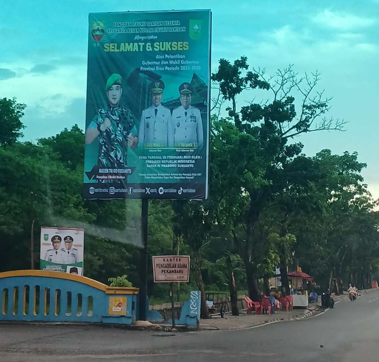 Namun, hingga sekarang ini tiang reklame di Simpang Parit Indah (Jalan Datuk Setia Maharaja – Sudirman) belum juga diroboh atau sebagaimana mestinya. Harusnya itu tiang reklame itu sudah diroboh dalam hal menegakkan aturan. Sambung dia, saat ini tiang reklame ilegal berdiri kokoh tersebut, ada terpasang baliho ucapan selamat dari Pangdam I Bukit Barisan kepada Gubernur Riau ini yang baru dilantik.