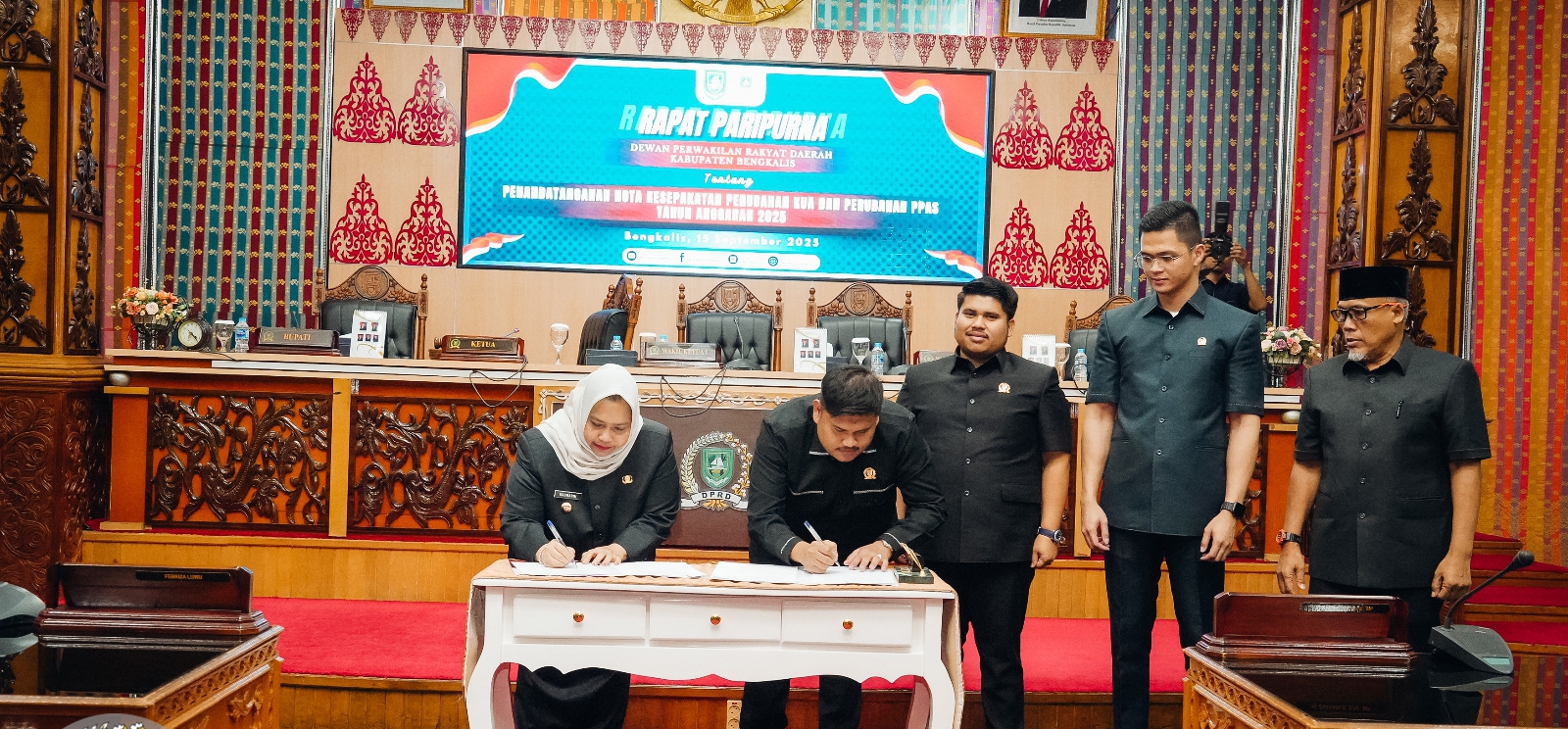Acara dilanjutkan dengan prosesi penandatanganan Nota Kesepakatan Perubahan KUA-PPAS Tahun Anggaran 2025 oleh Bupati Bengkalis dan Ketua DPRD Kabupaten Bengkalis.