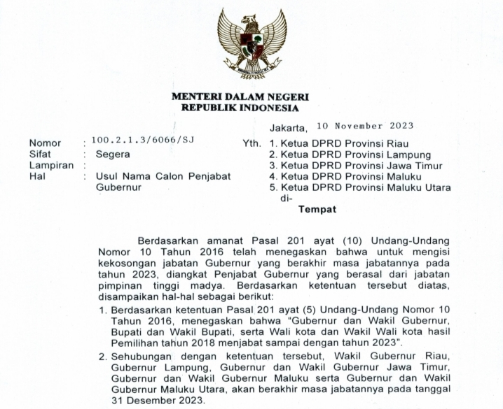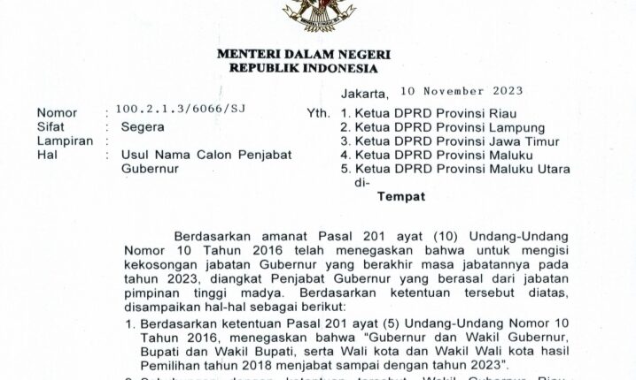“Iya benar, surat permintaan nama-nama Pj Gubri dari Kemendagri sudah masuk ke DPRD. Ini memang sesuai dengan mekanisme, satu bulan menjelang akhir masa jabatan Gubri,” kata dia, Senin (27/11/2023).