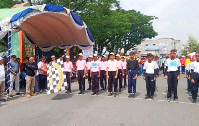 Hadir Staf Ahli Ahmad Syukur, mewakili Bupati Indragiri untuk melepas gerak jalan tingkat SMP/MTS yang berpusat di Lapangan Ruang Terbuka Hijau (RTH) Rengat, Sabtu (12/08/2023).
