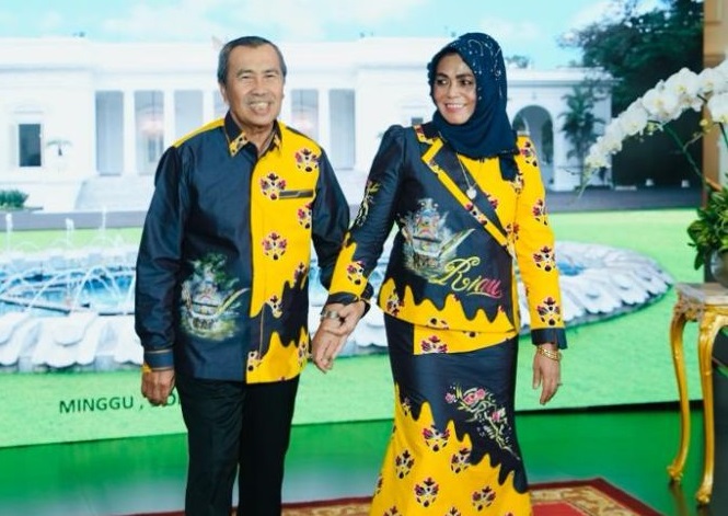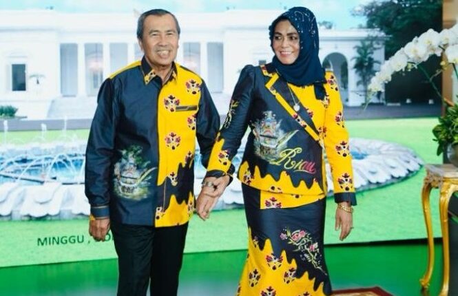 DERAKPOST.COM – Gubernur Riau Syamsuar beserta istri menampilkan batik riau hasil kreasi pebatik daerah, dengan motif perahu baganduang berpadu bunga kiambang dalam balutan warna kuning dan dongker.