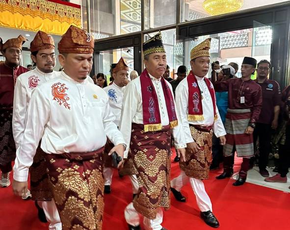 Pantauan lapangan, orang nomor satu di Provinsi Riau tersebut mengenakan baju Melayu lengkap berwarna putih dengan songket berwarna merah. Tak lupa tanjak berwarna hitam emas. Hal itu sama juga dipakai Pj Walikota Pekanbaru Muflihun dan Ketua DPRD Sabarudi.