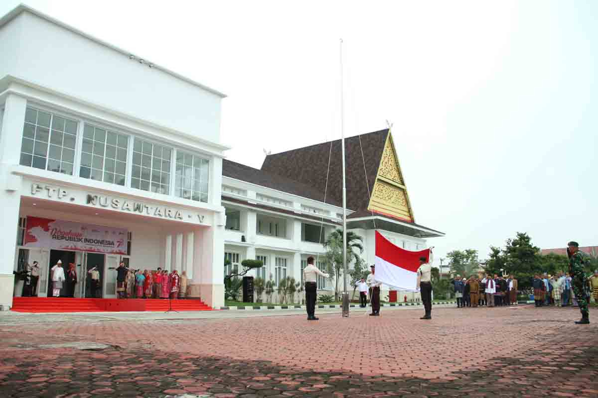 Namun, dalam upacara yang dipusatkan di halaman Kantor Direksi PTPN V Jalan Rambutan tersebut tampak berbeda. Pimpinan perusahaan tampil mengenakan beragam pakaian adat Nusantara, sementara para karyawan berseragam tradisional Teluk Belanga Riau lengkap dengan songket dan tanjaknya.