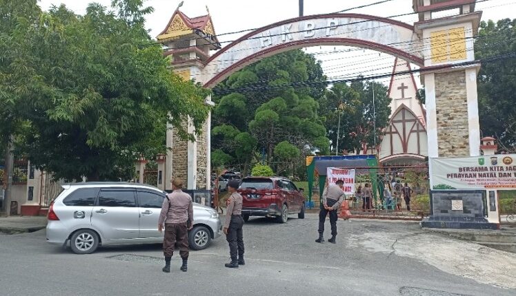 DERAKPOST.COM – Personel aparat mengatur lalu lintas masuk di Gereja HKBP Pekanbaru. Saat ini agendanya ibadah Natal 2023 di lokasi itu lancar.