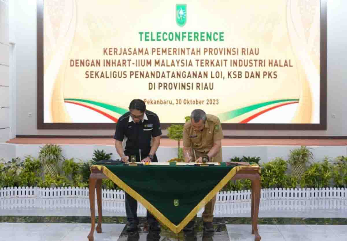 DERAKPOST.COM – Pemerintah Provinsi Riau bersama dengan International Institute for Halal Research and Training (INHART), International Islamic University Malaysia melalukan penandatanganan Letter of Intent (LOI) terkait industri halal, barlangsung di Gedung Daerah Balai Pauh Janggi, Senin (30/10/2023).
