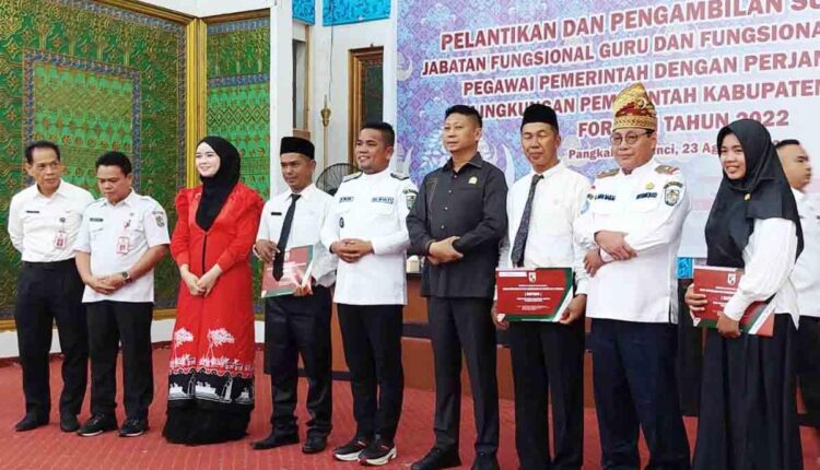 DERAKPOST.COM – Bupati Pelalawan, H Zukri melantik sebanyak 1.036 Pegawai Pemerintah dengan Perjanjian Kerja (PPPK) di Gedung Daerah Laksmana Mangkudiraja, Pangkalan Kerinci, Rabu (23/8/2023). Pelantikan diikuti 1.031 PPPK formasi guru dan 5 tenaga teknis penyuluh pertanian formasi 2022.