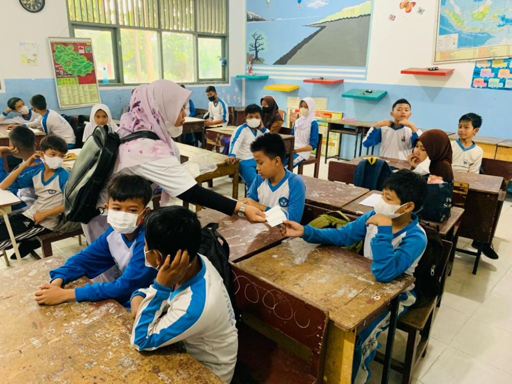 Yang mana pembagian masker dilakukan oleh petugas dari puskesmas, yang datang langsung ke 21 sekolah SD di Kota Pekanbaru.
