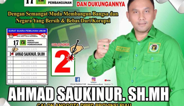 DERAKPOST.COM – Sukses pada dunia advokat, Ahmad Saukinur, SH MH yang merupakan kader dari Partai Persatuan Pembangunan (PPP) ini ikut serta pada pertarungan Pileg 2024. Kali ini maju ke DPRD Riau dari Dapil Kota Pekanbaru.