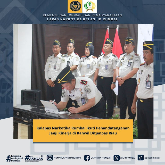 DERAKPOST.COM – Kepala Lembaga Pemasyarakatan (Kalapas) Narkotika Kelas IIB Rumbai, Reinhards Indra Pitoy, menghadiri langsung kegiatan Penandatanganan Perjanjian Kinerja dan Komitmen Pelaksanaan Janji Kinerja Tahun 2026.