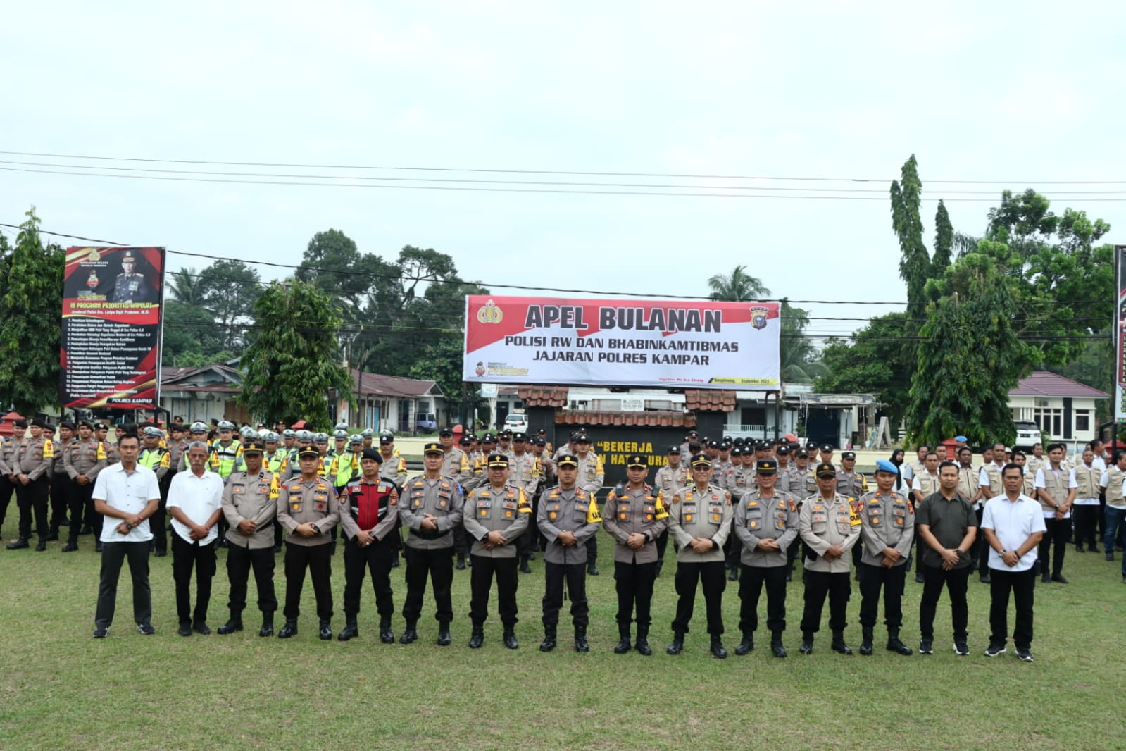 Apel Bulanan, Rabu pagi (13/09/2023) mulai pukul 08.00 WIB, ini dipimpin Kapolres Kampar AKBP Ronald Sumaja SIK dengan Perwira Apel Kasat Binmas AKP Era Maifo SHÂ dan Komandan Apel Jafni