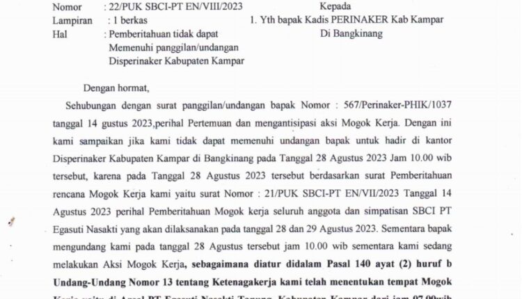 “Disperinaker Kampar memanggil atau mengundang kembali, namun diketahui untuk hari Senin itu, tanggal 28 Agustus 2023. Padahal, pada hari tersebut kami sedang melakukan mogok kerja di Areal PT Egasuti Nasakti Tapung, di Kampar. Catatan kami, jadi meragukan maksud undangan ini, karenanya kami tak bisa hadir,” ungkapnya.