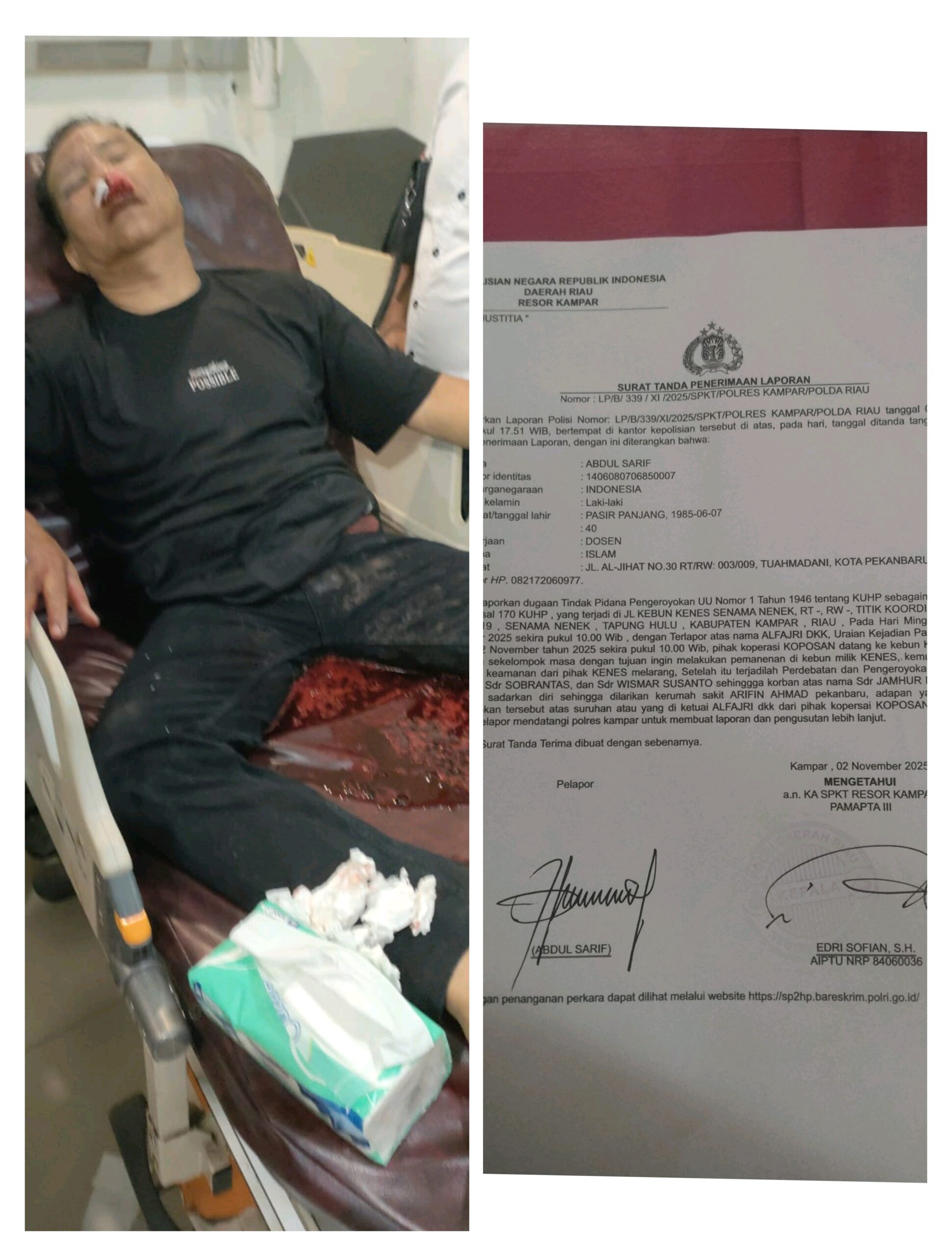 DERAKPOST.COM — 2 November 2025.Telah terjadi insiden kekerasan dan penyerangan terhadap pihak Koperasi KNES di area kebun kelapa sawit yang berlokasi di Desa Senama Nenek, Kecamatan Tapung Hulu, Kabupaten Kampar, Riau, pada Minggu, 2 November 2025 sekitar pukul 10.00 WIB.