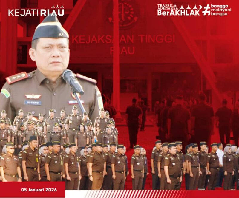 DERAKPOST.COM – Awal tahun 2026, hal itu juga ditaja apel kerja yang berlangsung di di halaman Kantor Kejati Riau, pada hari Senin (5/1/2026). Apel ini tampak dipimpin langsung Kepala Kejati Riau Sutikno, diikuti para Asisten serta seluruh pegawai.