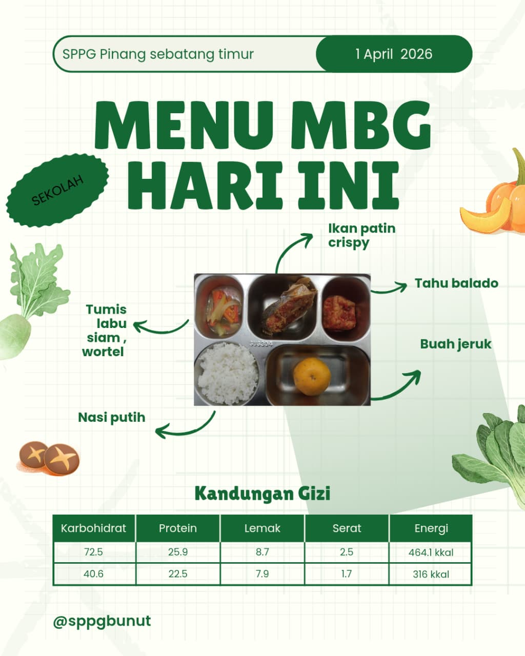 Untuk menu pembuka bulan April ini, pihak SPPG menyajikan paket makanan segar yang terdiri dari nasi putih, patin krispi, tahu balado, tumis labu siam wortel, serta buah jeruk sebagai sumber vitamin.