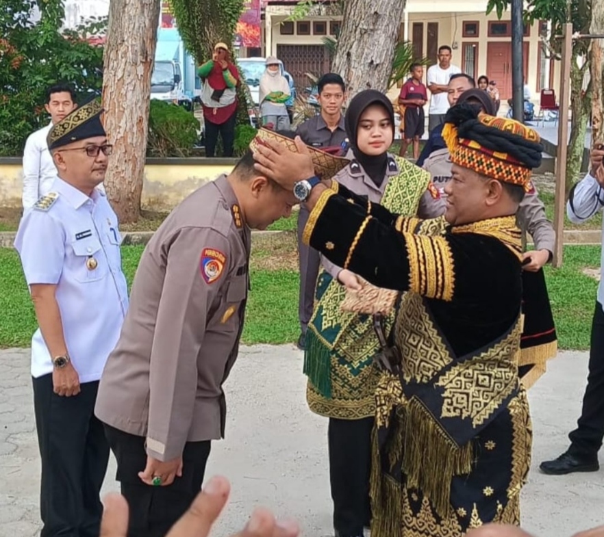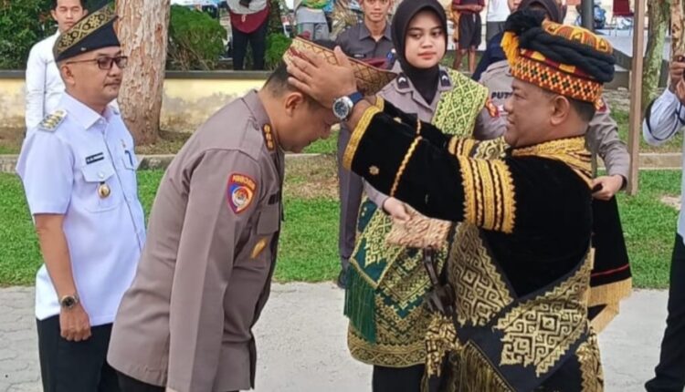 Ketua Lembaga Adat Kampar (LAK), Drs Yusri MM lakukan pemasangan Tanjak dan Selempang kepada Kapolda Riau diwakili Karo Rena Polda Riau KBP Novi Irawan, S.I.K.,M.H.
