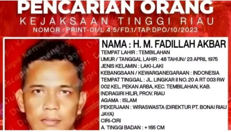 Itu disebabkan Fadillah selalu mangkir dari panggilan penyidik Pidana Khusus Kejati Riau. Fadillah masuk dalam daftar pencarian orang berdasarkan surat Nomor PRINT-01/L.4.5/FD.1/TAP.DPO/10/2023 tertanggal 19 Oktober 2023, kini menjadi fokus perburuan pihak berwajib. “Foto dan identitasnya sudah disebar oleh Kejati Riau,” sebut Kepala Seksi Penerangan Hukum Kejati Riau, Bambang Heripurwanto.