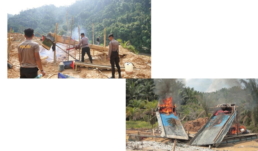 Sementara di Desa Petapahan ditemukan 4 rakit dompeng, 1 alat dulang, 1 karpet sintetis, 1 pipa 10 inchi, dan 1 set kunci-kunci. “Semua barang bukti rakit kecuali mesin, karpet, dimusnahkan di tempat dengan cara dibakar,” imbuhnya.