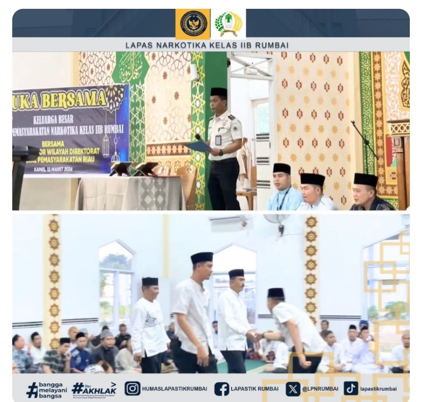 DERAKPOST.COM – Lapas Narkotika Kelas IIB Rumbai menggelar kegiatan berbuka puasa bersama yang dihadiri oleh jajaran Kantor Wilayah Direktorat Jenderal Pemasyarakatan (Ditjenpas) Riau, Kamis (12/03/2026). Kegiatan tersebut dilaksanakan di Masjid At-Taubah Lapas Narkotika Rumbai.