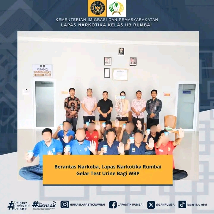 DERAKPOST.COM Lapas Narkotika Kelas IIB Rumbai taja tes urine bagi pegawai dan Warga Binaan Pemasyarakatan (WBP). Ini  sebagai bentuk komitmennya mendukung program Menteri Imigrasi dan Pemasyarakatan (Menimipas). Program ini menargetkan pemberantasan peredaran narkoba di lapas dan rutan, guna menciptakan lingkungan pemasyarakatan yang bersih dari narkoba, Jum’at (27/3/2026).