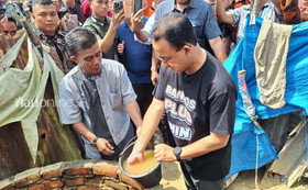 Kemudian Anies yang dikawal ketat, menuju sumur air kumuh yang berada di belakang Musala Quba. Anies bahkan sempat menimba air dalam sumur dengan ember.