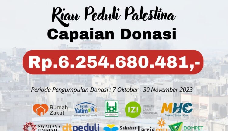 DERAKPOST.COM – Forum Zakat (FOZ) Riau mengumumkan hasil rekapan penggalangan donasi Peduli Palestina di Riau. Donasi Palestina yang dihimpun dari 15 LAZ anggota Forum Zakat (FOZ) Riau telah mengkonfirmasi rekapan lanjutan pasca kegiatan Tabligh Akbar bersama Ustadz Abdul Somad. Donasi penghimpunan dihitung mulai periode donasi dari 07 Oktober sampai dengan 30 November 2023. Total donasi telah dihimpun sebesar Rp. 6.254.680.481.