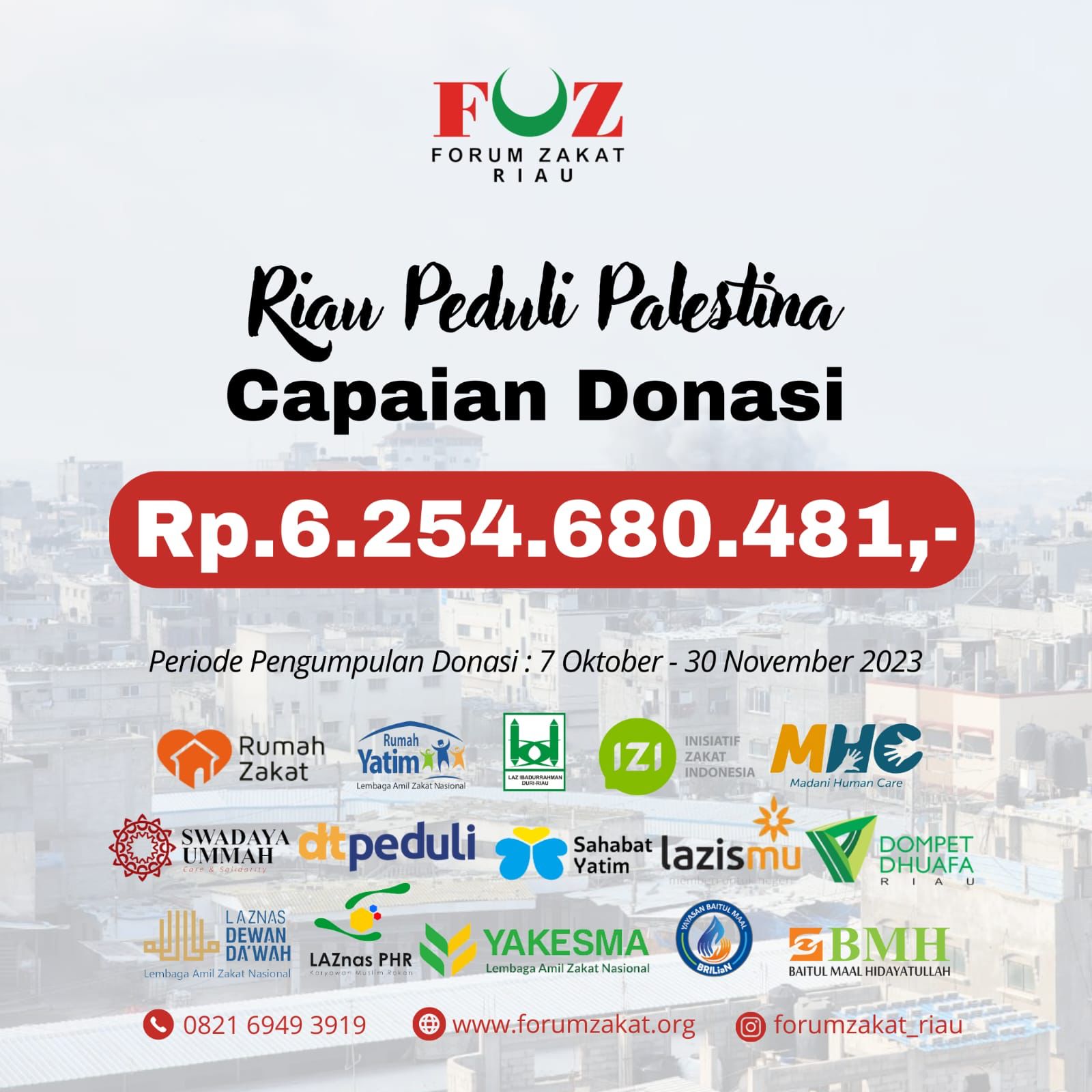 Forum Zakat (FOZ) Riau terus mengajak kepada masyarakat untuk berdonasi untuk Palestina melalui lembaga resmi, dan FOZ Riau akan mengupdate perolehan sampai dengan akhir Desember 2023, yang akan dirilis awal Januari 2024, hasil pengumpulan sejak Oktober 2023 hingga akhir Desember 2023”, pungkas Iqbal Farizi, Sekretaris FOZ Riau. **Rul