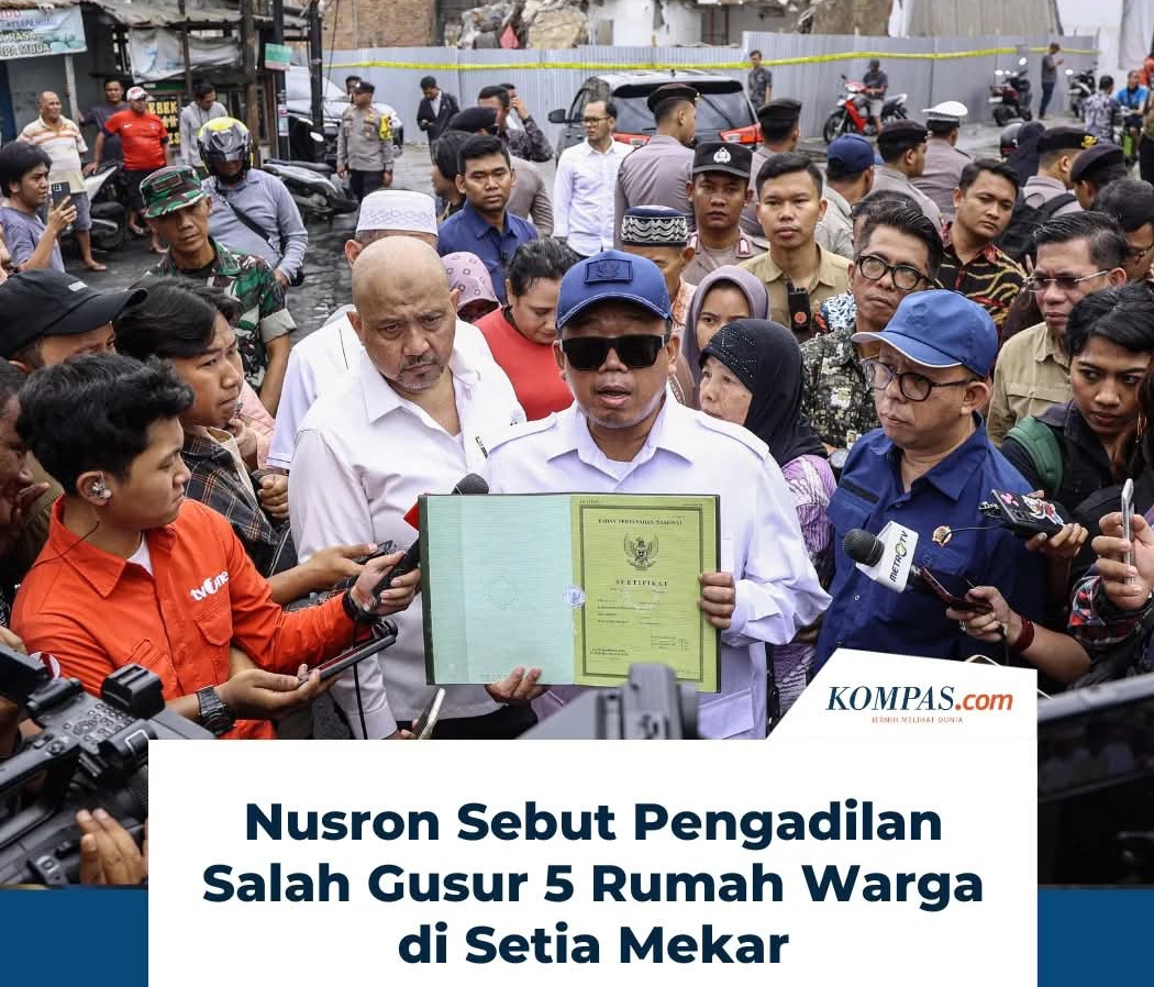 DERAKPOST.COM – Menteri Agraria dan Tata Ruang/Badan Pertanahan Nasional (ATR/BPN) Nusron Wahid ungkap bahwa  Pengadilan Negeri (PN) Cikarang Kelas II salah menggusur lima rumah warga dalam sengketa lahan seluas 3,6 hektar di Desa Setia Mekar, Tambun Selatan, Kabupaten Bekasi.