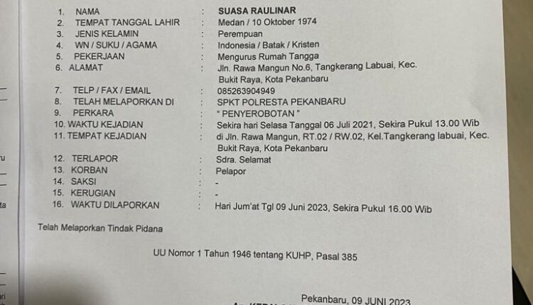 DERAKPOST.COM – Merasa tertipu pada membeli satu unit Ruko, yang berlokasi di Jalan Rawamangun, Kota Pekanbaru. Maka disikapi Suasa Raulinar ini dengan melaporkan Selamat ke Kepolisian. Hal itu dilaporkan tanggal 9 Juni 2023.