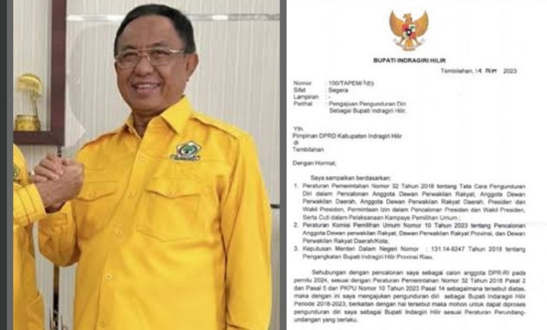 Pengajuan pengunduran diri bupati ini , tertanggal 14 September 2023 tersebut ditujukan ke Pimpinan DPRD Kabupaten Inhil ditembuskan pada Menteri Dalam Negeri (Mendagri) Tito Karnavian serta Gubernur Riau (Gubri) Syamsuar.Ā Dalam surat itu, Wardan menjelaskan bahwasa pengunduran dirinya berpatokan kepada beberapa peraturan, lantaran Ia akan maju di Pemilu 2024 sebagai Caleg.