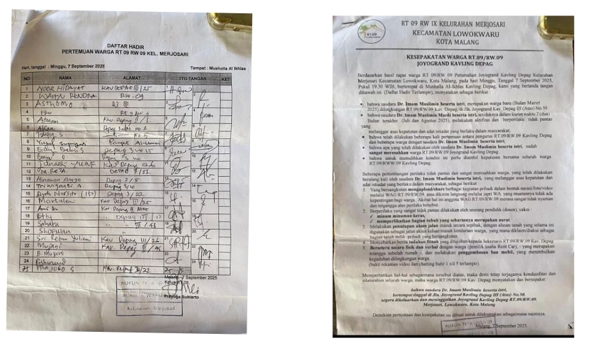 Karena adanya persoalan itulah, lanjut Prajogo, warga kemudian bersepakat untuk meminta Imam Muslimin beserta istrinya untuk dikeluarkan dan meninggalkan lingkungan RT09/RW09 Joyogrand Kavling Depag III Atas.