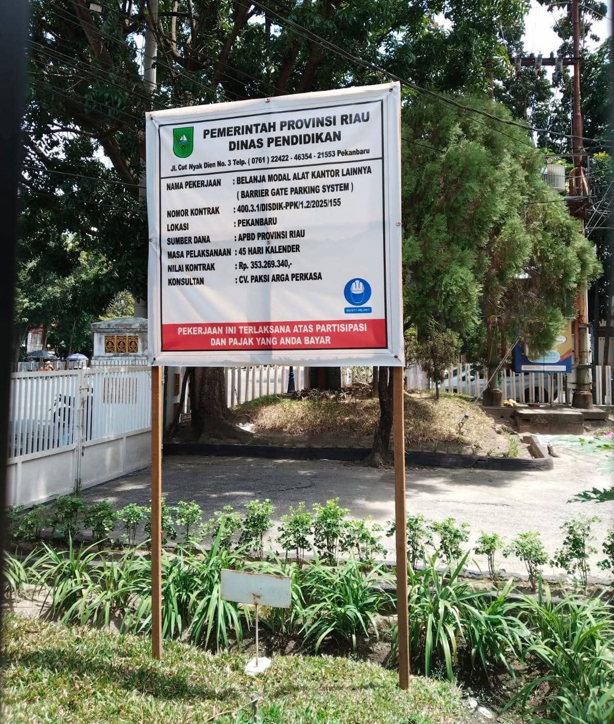 Papan proyek pembangunan Barrier Gate Parking System (Portal Elektrik), di Kantor Disdik Riau ini diketahui senilai Rp353 juta. Hal itupun menjadi sorotan publik, disebab selain nilai proyek begitu cukup besar, juga dipapan nama itu tidak tersedia atau ditulis nama perusahaan pelaksana proyek. Pada plang nama itu hanya ada ditulis konsultan pengawas, yakni CV Paksi Arga Perkasa.