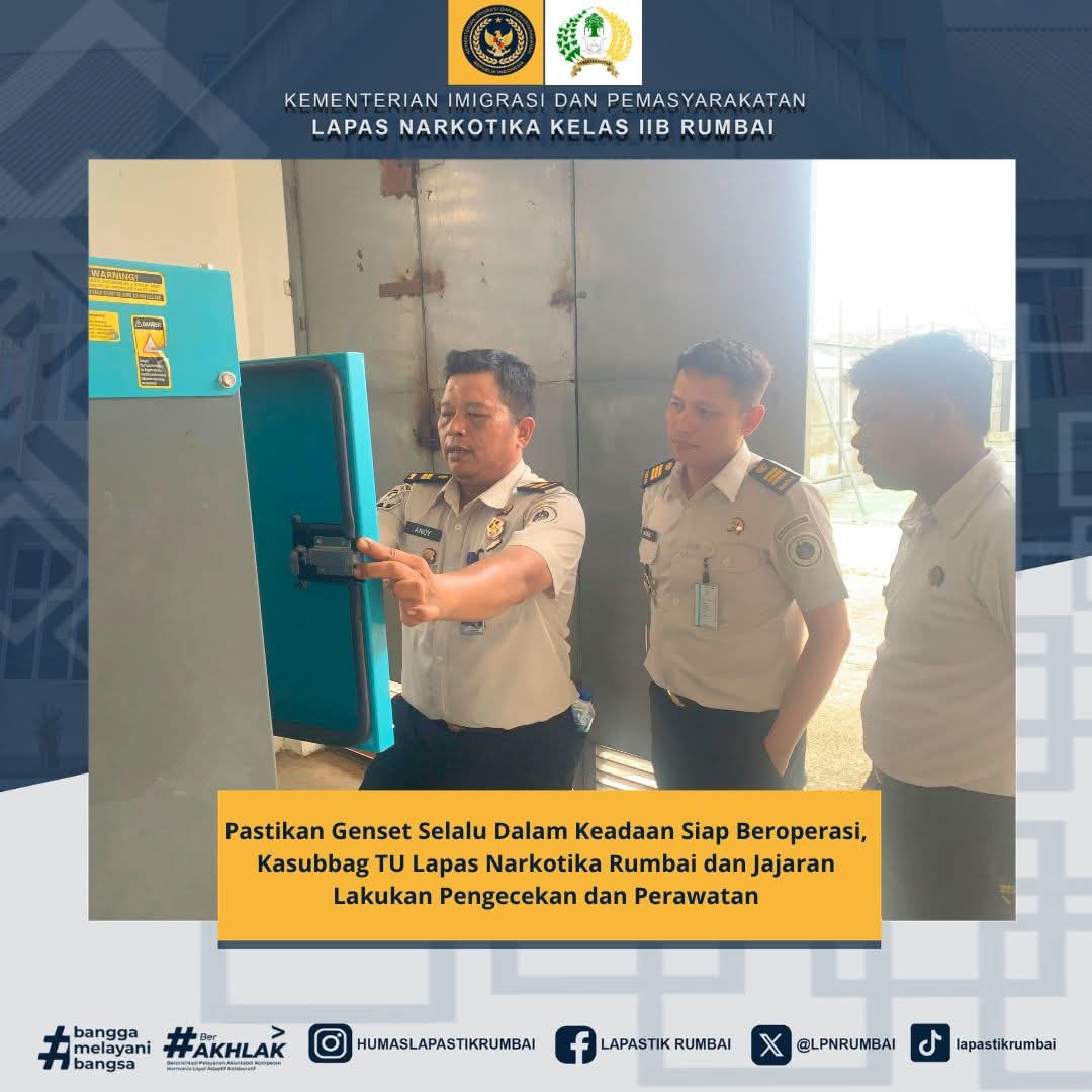 DERAKPOST.COM – Sadar akan pentingnya pasokan listrik, Lembaga Pemasyarakatan Narkotika Kelas IIB Rumbai, Kasubbag TU Lapas Narkotika Rumbai, Ade Kurniawan dan Jajaran melakukan perawatan genset. Selasa, (14/4/2026).