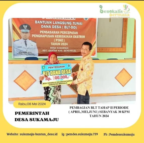 Dalam pelaksanaan penyerahan BLT Tahap II Tahun 2024 di hadiri Kepala Dusun yang mewakili PJ Kepala Desa dan Sekretaris Desa berhubung Dinas di luar. juga hadir. BPD Desa Suka Maju, Ketua Rt/Rw, serta segenap Staf / Perangkat Desa Suka Maju dan Masyarakat Penerima manfaat BLT Tahap II Tahun 2024
