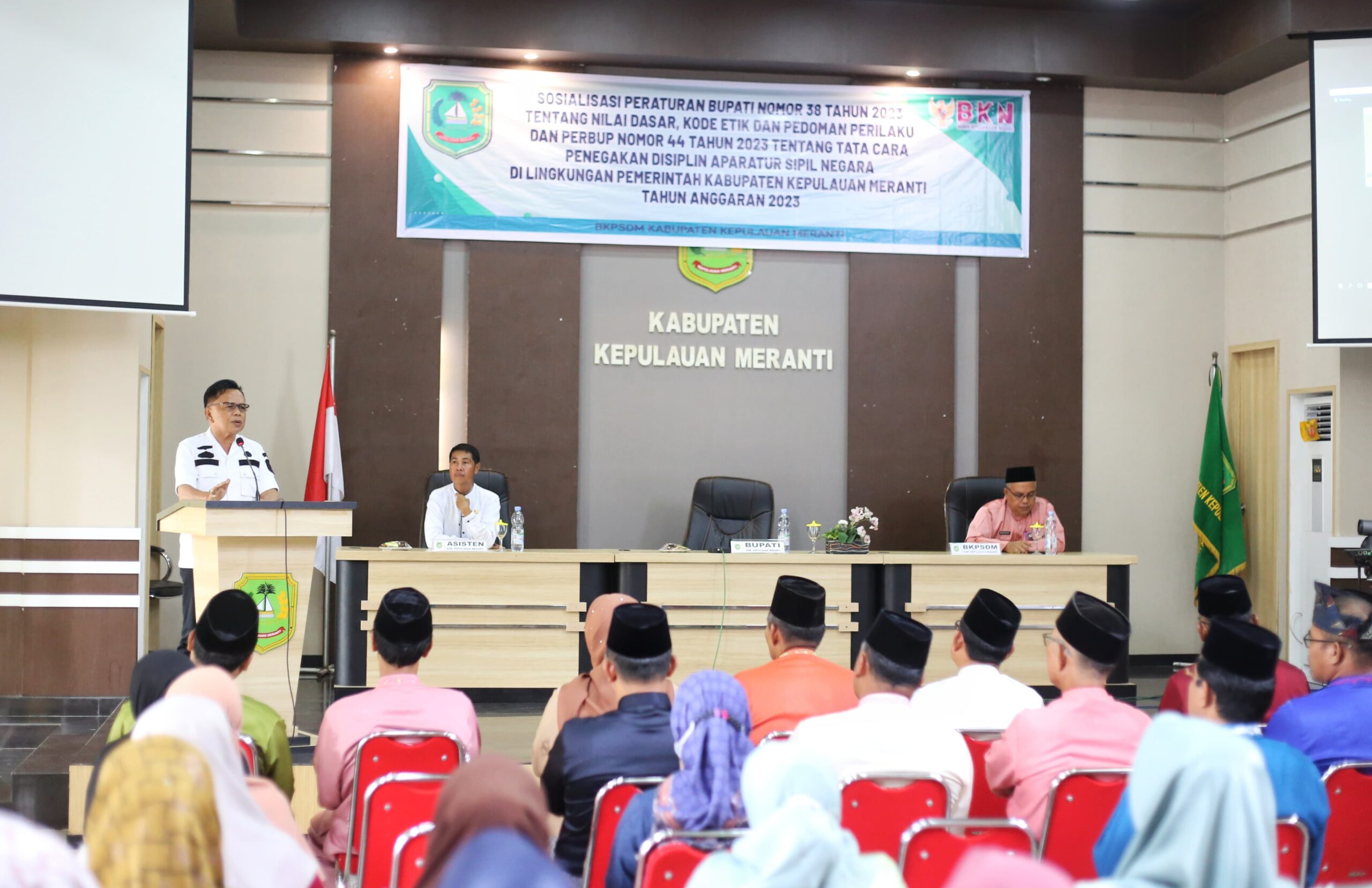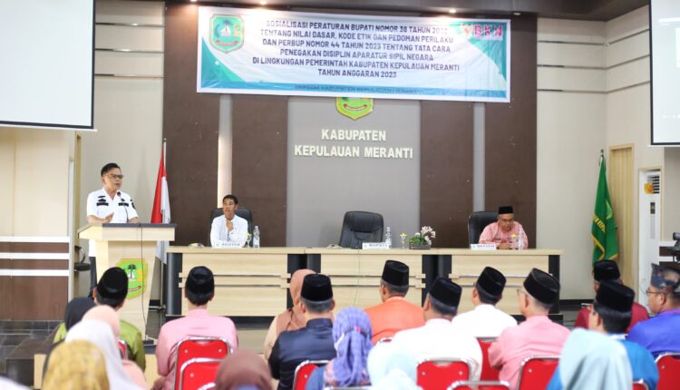 DERAKPOST.COM – Pemerintah Kabupaten Kepulauan Meranti menggelar Sosialisasi Peraturan Bupati (Perbup) nomor 38 Tahun 2023 tentang Nilai Dasar Kode Etik dan Pedoman Perilaku Aparatur Sipil Negara (ASN) dan Perbub nomor 44 Tahun 2023 tentang Tatacara Penegakan Disiplin ASN.
