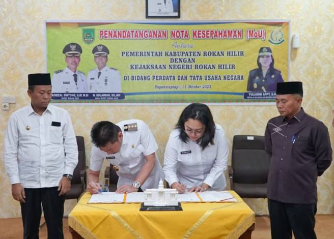 MoU itu ditandatangani langsung oleh Bupati Rohil Afrizal Sintong dan Kepala Kejari Rohil Yuliarni Aphy yang disaksikan langsung Wakil Bupati Sulaiman, Kasi Datun Rendi Panalosa, Wakil Ketua DPRD Basiran Nur Efendi, para asisten dan seluruh kepala dinas dilingkungan Pemkab Rohil.