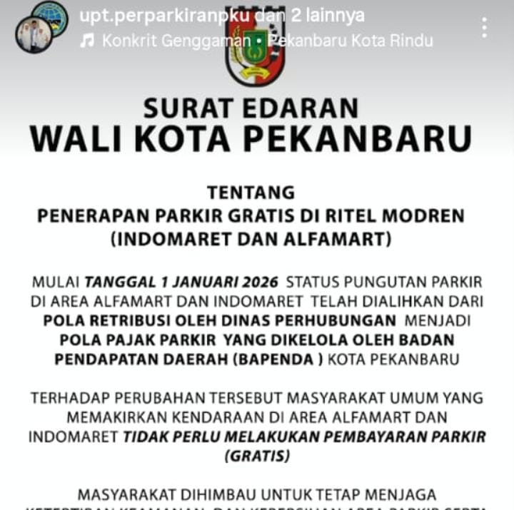 Pemerintah Kota (Pemko) Pekanbaru resmi menerapkan kebijakan parkir gratis di seluruh gerai ritel modern Alfamart dan Indomaret. Kebijakan ini mulai berlaku pada 1 Januari 2026, sebagaimana disampaikan melalui surat edaran Walikota Pekanbaru.