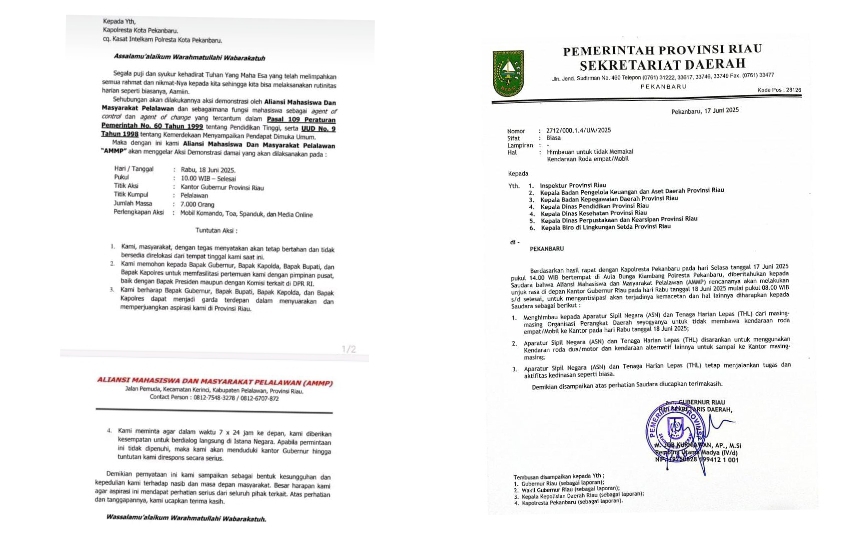 Pemprov Riau terbitkan imbauan ASN, dan THL tak bawa kendaraan karena ada demo besar-besaran besok. “Seluruh ASN, PNS, PPPK, dan THL tetap diminta hadir bekerja sebagaimana mestinya. Tapi diminta untuk tak bawa kendaraan roda empat,” demikian bunyi imbauan dalam surat tersebut.