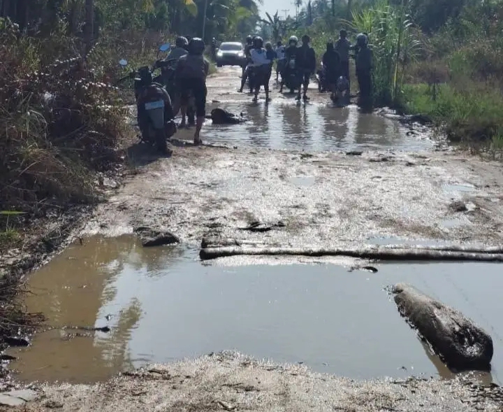 Warga bahkan terpaksa menimbun jalan menggunakan batang kelapa sebagai pijakan darurat agar kendaraan masih bisa melintas, meski dengan risiko tinggi.