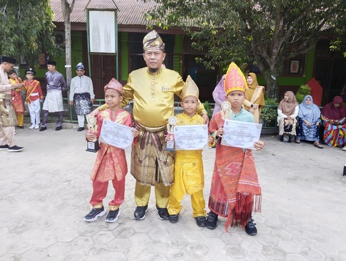 Kepala SDN 006 ini memberikan piagam penghargaan dan piala kepada dua siswa, yaitu Farel Al Hidayat dan Alfie Maulana, yang berhasil melaju ke tingkat kabupaten dalam Olimpiade Olahraga Siswa Nasional (O2SN) cabang senam artistik.