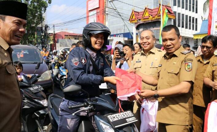 DERAKPOST.COM – Pj Walikota Pekanbaru Muflihun membagikan Bendera Merah Putih kepada pengguna jalan, Senin (7/8/2023). Kegiatan ini dilakukan untuk menyemarakkan hari ulang tahun (HUT) RI ke-78.